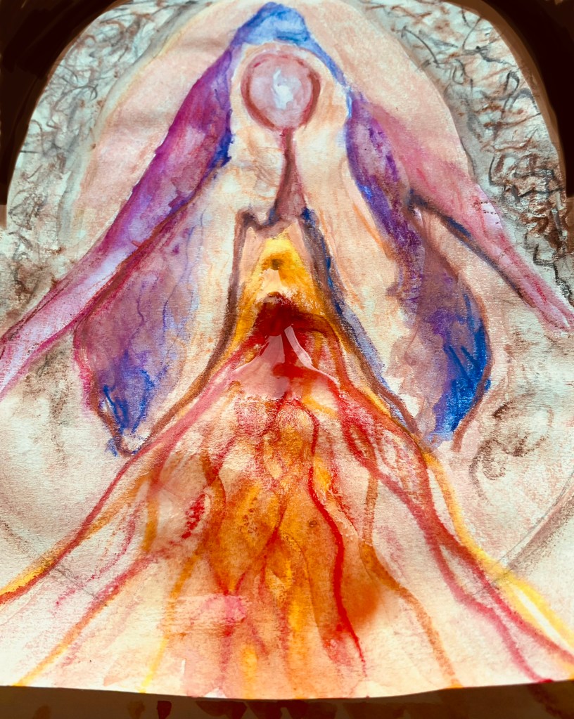 Na het meesterwerkje van gisteren, vandaag gewoon weer opnieuw begonnen. Eerst gemediteerd. Tijdens de meditatie heel wat pissigheid en pijn gevoeld op een oud moeder/dochter verhaal, waarin ik me identificeerde met de dochter die nooit eens voor vol werd aangezien. Het kwam me letterlijk de strot uit. Aaaaaaaaaaaaaaaaaaaaa klonk ik vanuit mijn hart en mijn tranen stroomden. Daarna begon ik zachtjes te neuriën voor mezelf. Ik stelde me voor dat ik vleugels zou laten groeien aan de Clitootje selfie van gisteren. Mooi idee, maar niet kloppend bij waar ik nu mee ben. Dus vandaag deel ik hier een vrij aardse Clitootje. Ik hoop dat jullie hier ook de schoonheid van kunnen zien. En anders is het jammer voor jullie