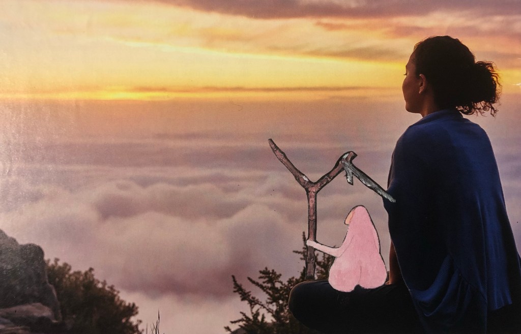 Dit is een zelfportret. Ik laat mezelf zien, en ik zie mezelf. Ik droom van de gouden toekomst en die is nu misschien nog in nevelen gehuld, maar ik heb er vertrouwen in. Boven de wolken schijnt altijd de zon (of de maan en de sterren).