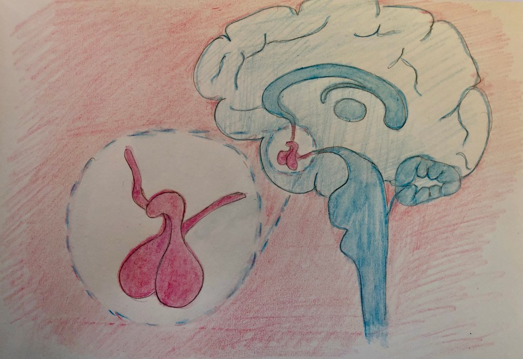 Het hersenaanhangsel oftewel de hypofyse is een klier midden in het hoofd, onder de hersenen, die 9 hormonen afscheidt die de homeostase reguleren.