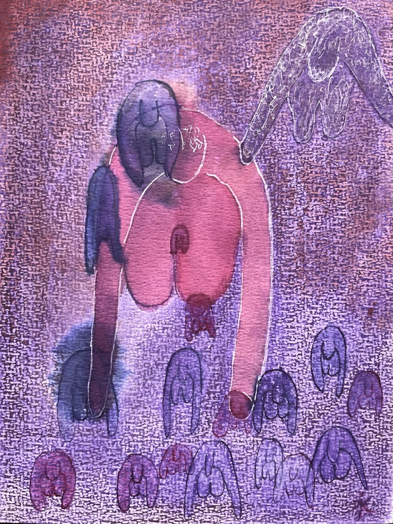 Nooit weet ik van tevoren precies wat mijn potlood, pen, stift, krijtje of penseel me zal brengen. Spannend is dat. Kwetsbaar. Ik groei en ontwikkel me door dit tasten in het duister. De titel van deze blog ‘Vaderwond’ is ook intuïtief gekozen. Ik zit in een diep proces van onthechting, verbinding, verweving, ontrafeling. Vanochtend voelde ik (en nog wel trouwens) een blauwe, donkere, stramme pijn in mijn rechterpols, die verbonden is met een dove pijn in mijn schouder en mijn rechterzijde en de plek ‘waar vroeger mijn vleugel zat’ (dankjewel voor deze poëtische omschrijving van het schouderblad Nathalie (¡)