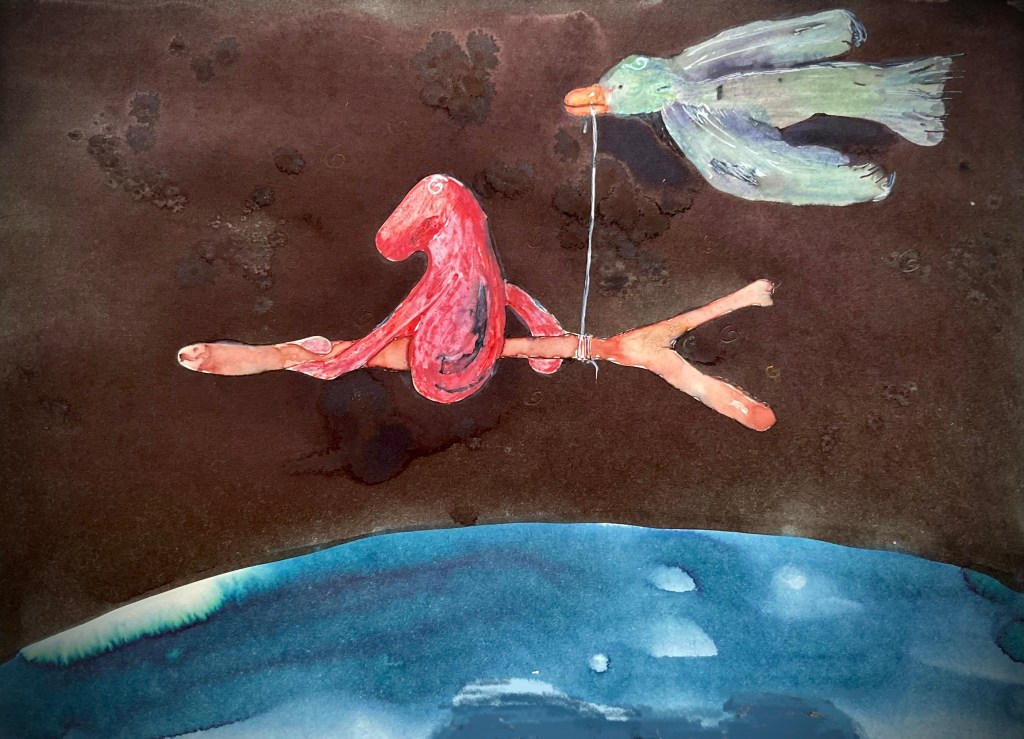 Dus, toen de zon opkwam tilde ik Beertje van mijn schoot, deed de lampjes uit, zette het lege bakje hemelse modder in de gootsteen, en vloog ik naar boven naar mijn tekenkamertje. Kaarsje aan, aarden, voelen, luisteren… en intussen zat ik al druk in mijn hoofd een voorstelling te maken van C. op haar Nimbus 2000.