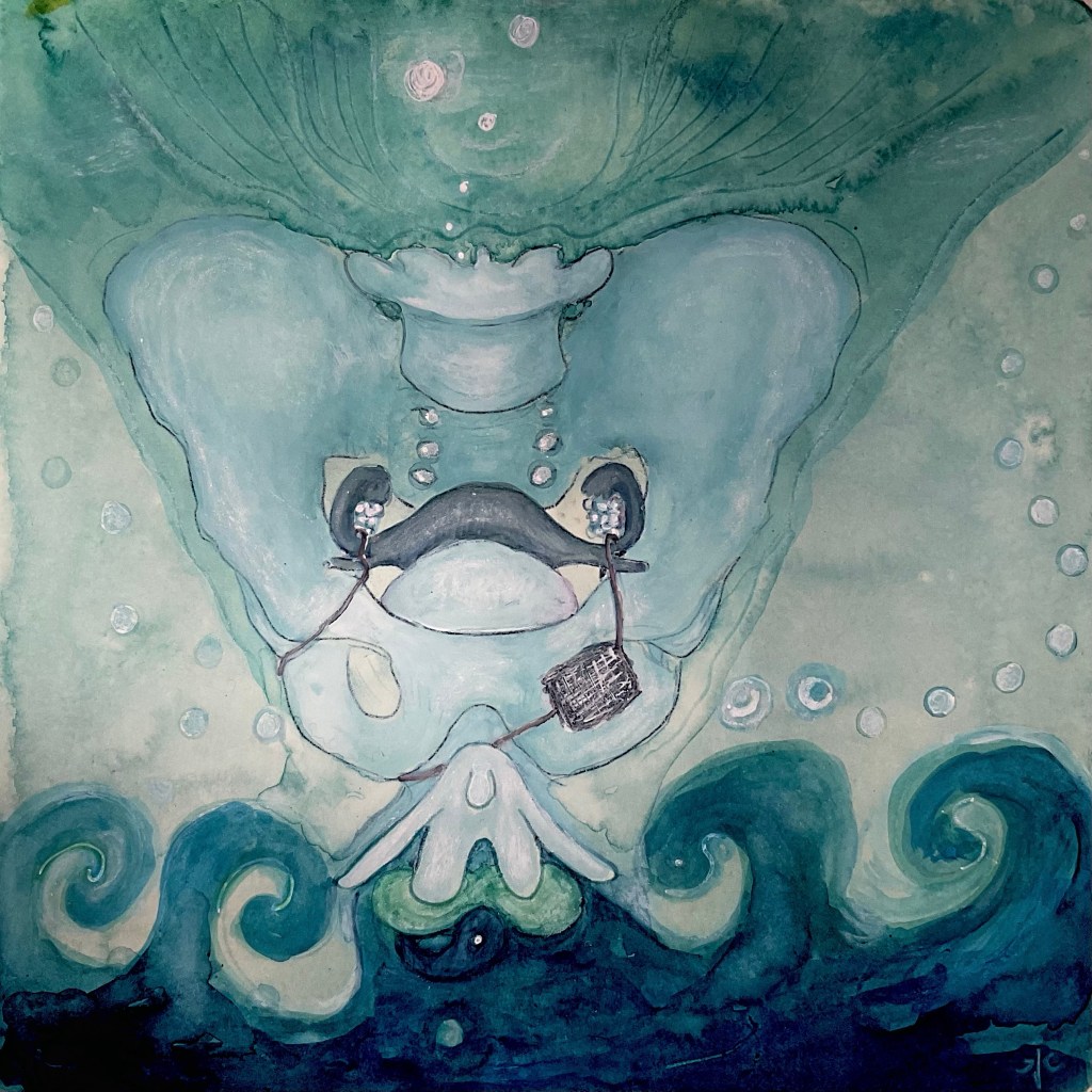 Toen was Clitootje zelf aan de beurt. Ik liet haar gewoon een stapje naar voren doen, zodat ze weer helemaal vrij in beeld was. Toen schilderde ik een paar wilde woeste baren 🌊🌊 want ik voelde me superveilig met het hele bekken inclusief heiligbeen, staartbeen en de voortplantingsorganen achter me.