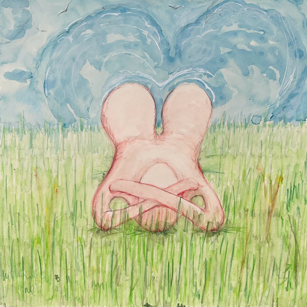 Het gras tekende ik geïnspireerd door de hartslag van de drum. En Clitootje liggend op haar rug in het gras stijgt bijna op als een ballon en voelt zich zo vrij als de vogels die spelen met de wind.