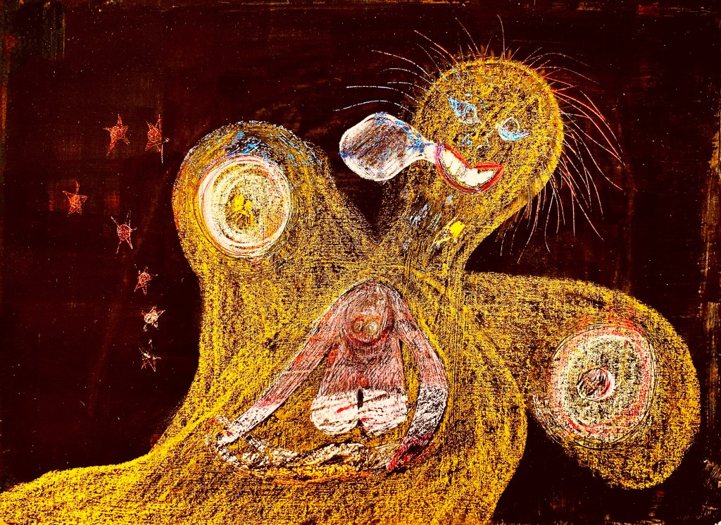 Deze tekening maakte ik met wasco, heel snel en vrij, want ik had bedacht dat ik er daarna tòch met zwart overheen zou gaan (om duistere redenen) en dan daarna een Clitootje tekening er tevoorschijn uit zou krassen. Dat tekenen met wasco was erg fijn om te doen. Schaamteloos vrij en kritiekloos want niemand zou het toch verder hoeven te zien. Wel nam ik even een foto ervan. (En zo kan ik jullie nu tòch meenemen in het scheppingsproces, hihi)