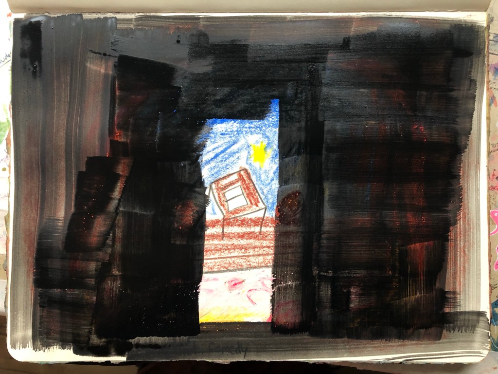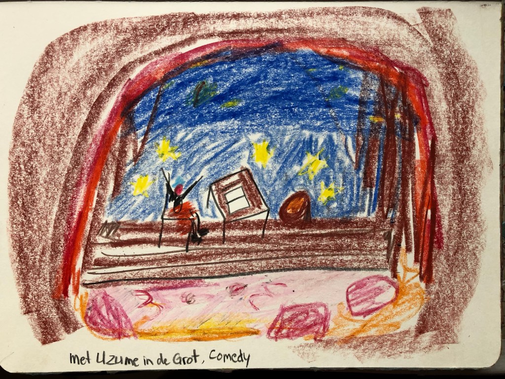 Ik moest ook de grot in. Het was er warm en prettig, een klein dansend zonnetje leidde me dieper de grot in, door het duister tot Uzume, die me lachend en hartelijk in haar onderwereld verwelkomde. We ploften neer op zachte kussens voor een leeg toneel. Ik vroeg haar om de humor van mijn situatie (visionair zonder visioen) te helpen inzien. Terwijl ik haar alle details vertelde werd de hele situatie zichtbaar op het toneel (met de snelheid van het licht, want zo gaat dat via je voorhoofd chakra). Toen ik klaar was liet ze me de situatie nog eens zien, maar nu werd de scene verbeeld als komedie, gespeeld door mijn favorite comedienne (ik denk nu aan Pauline Cornelisse). Dat werkte goed.