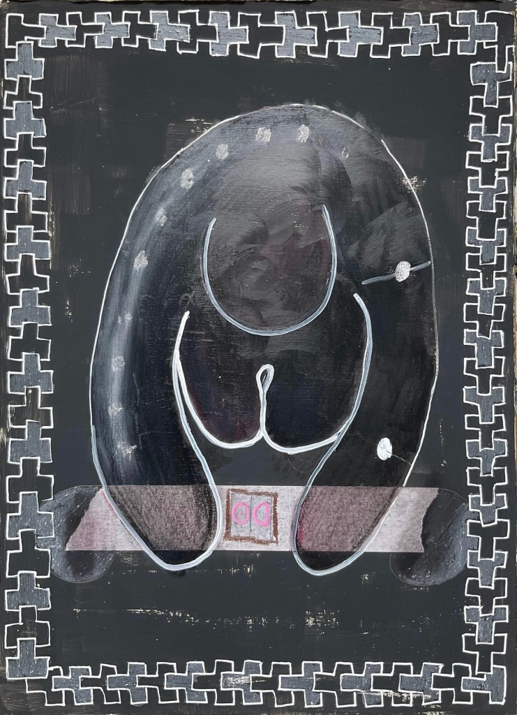 Toen mijn angsten lekker veilig toegedekt waren door de zwarte verf (die lekker snel droogde in het zonnetje) had ik zin om er met een witte gelstift een mooie rand omheen te tekenen. Bestaand uit het oude Maya-symbool voor Wind (spirit, die spreekt vanuit het hart) dat tevens het symbool is voor de staart van de ratelslang. Een soort open T