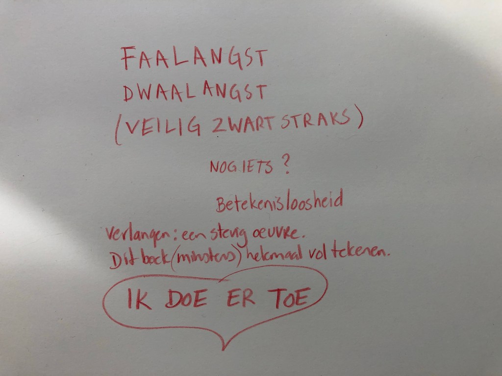 Dus ik dacht: Fùck it ! En ik schreef met een rood potlood op mijn mooie dikke tekenpapier mijn angst op en bedacht dat ik er daarna met zwarte plakkaatverf lekker overheen zou schilderen. (Goed idee van dr.Arts)