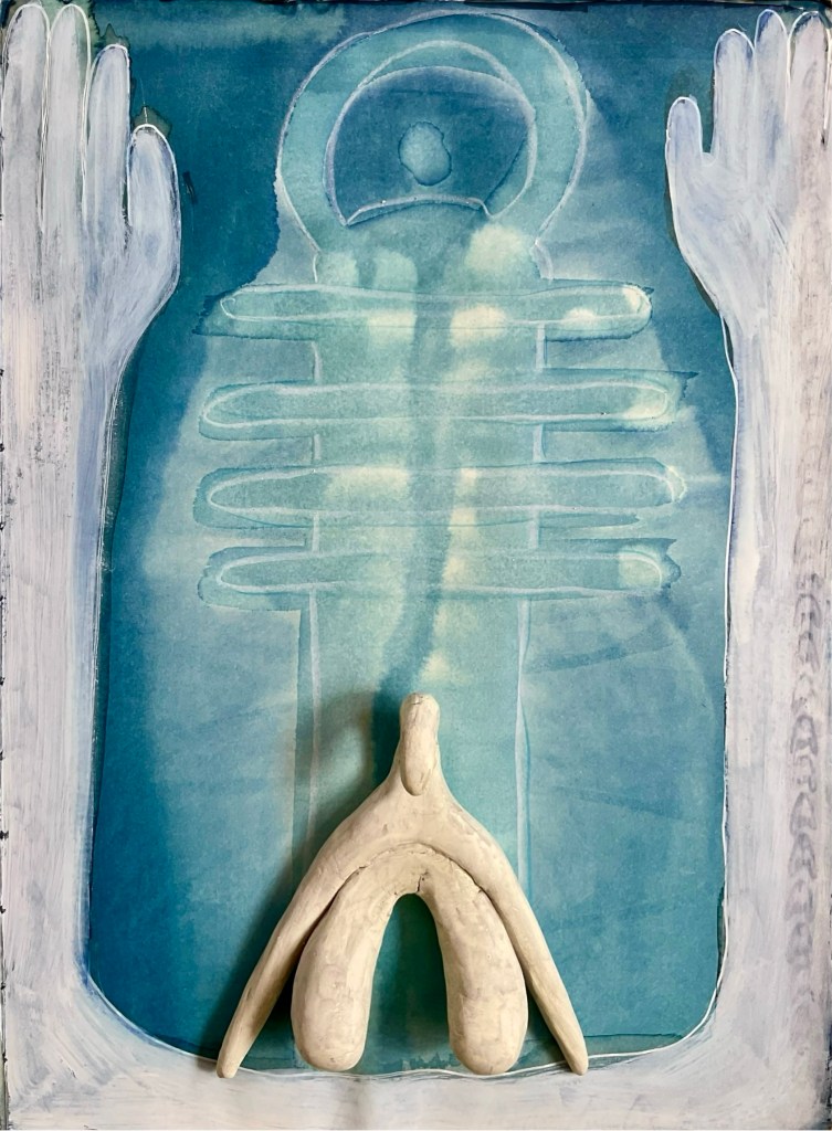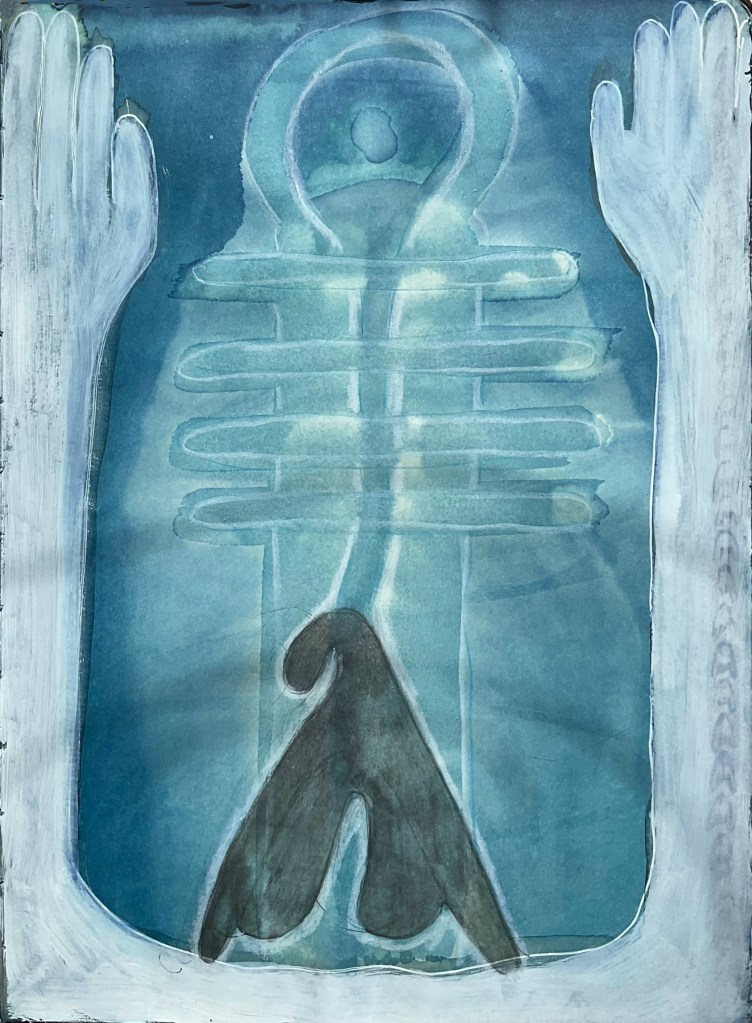 Toen ik vandaag weer zin kreeg om te gaan schilderen verbaasde het me dan ook niet dat het Djed symbool op papier verscheen. Daaromheen wilde ik weer een omlijsting maken. Ik begon met allemaal kleine Clitootjes in inkt te tekenen, maar uiteindelijk werd het een groot ‘hiëroglief’ van de Ka.