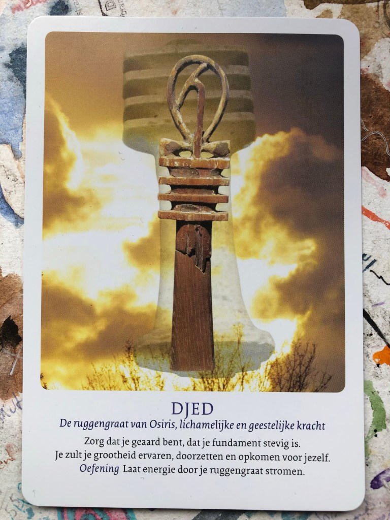 Ik ben een beetje aan het neuzen geweest in mijn boeken ‘het Egyptische dodenboek’, ‘Dood en begrafenisrituelen in het oude Egypte’ en één van mijn favoriete naslagwerken: ‘Isis en de 14 sleutels tot heelwording’ van Petra Stam en Els Lijesen. Daarnaast trek ik regelmatig een kaart uit het dek ‘Sekhmet’ (Petra Stam) en de ‘Isis mysteriekaarten’ (Petra en Els). Zo raak ik geleidelijk aan meer en meer vertrouwd met allerlei symbolen en krachten uit de rijke Egyptische cultuur. Niet alleen door erover te lezen, maar ik mediteer er ook mee en doe energetische oefeningen, die ik vind in de boeken van Petra en Els. Een tijdje geleden trok ik de Djed kaart ; ‘de ruggengraat van Osiris’ (zie foto) en besloot ik er een 3D-beeld van te maken. (Nog in wording). Ook tijdens de Movement Medicine danssessies olv Johanna Gielen dansten we bewust voelend met de ruggengraat.