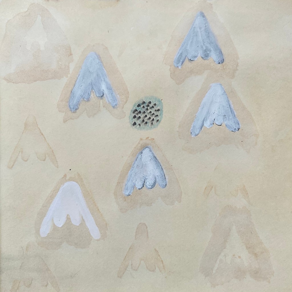Gisteren begon ik met een clitootje sjabloontje van karton, die ik op papier met ossengal omtrok. Daarna schilderde ik er een aantal dicht met witte plakkaatverf. Het leken meer spookjes. In gedachten hing ik rond op het voorouderveld, waar ‘ze’ gezellig om het vuur zouden zitten te chillen, maar het vuur was uit en degene die ik zocht miste ik vooral..schimmen, mist.. Hier een foto van het eerste zoekende stadium. (Misschien leuk om straks met het eindresultaat te vergelijken).