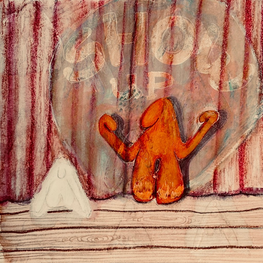 Leuk! Dat opende weer perspectieven… ik bedacht dat ze met haar handpoppen een podium verdiende. Met rechte verticale lijnen (de gordijnen) en horizontale lijnen (de podiumvloer) voor de spanning. Ik tekende en krijtte, veegde en gumde tot het papier echt niet meer lagen kon verdragen. Maar het was nog niet af, dus ik maakte een foto van de tekening en voegde er digitalerwijs nog wat meer lagen, filters en vegen aan toe. Hihi, wat een moderne kunstenaar ben ik toch (¡)