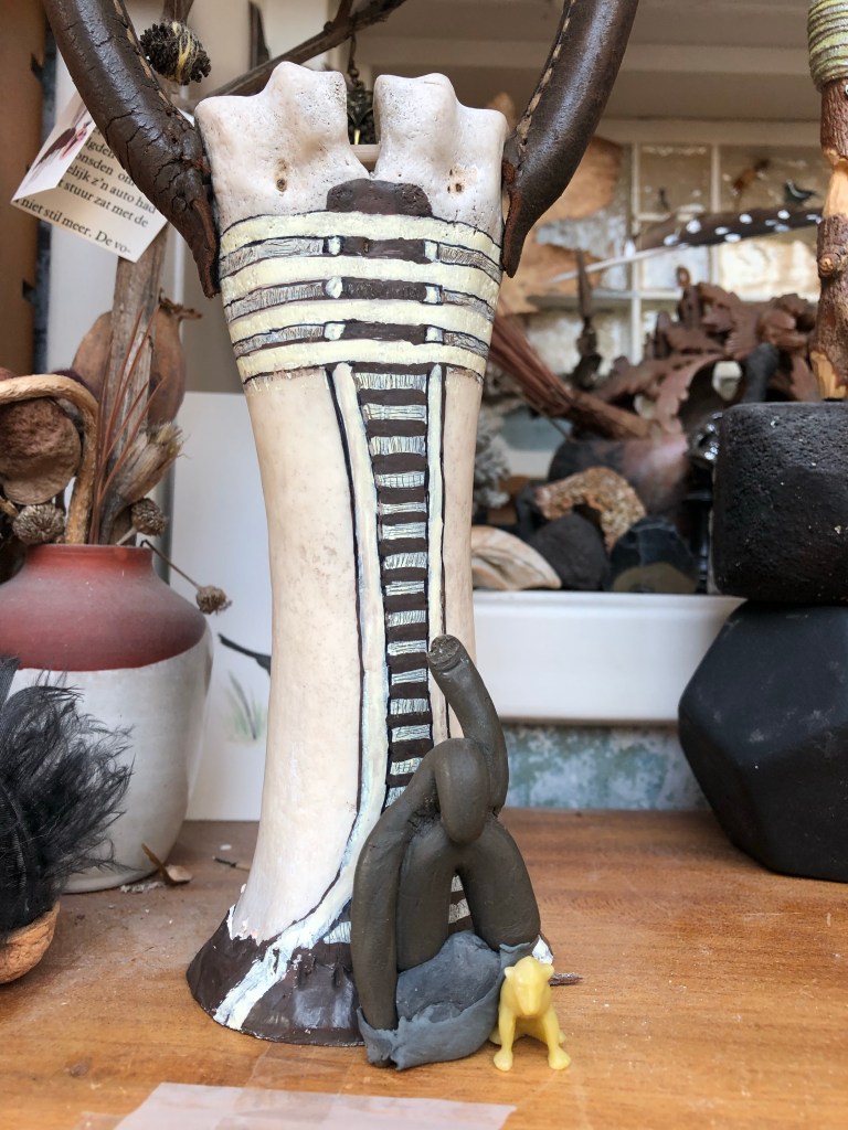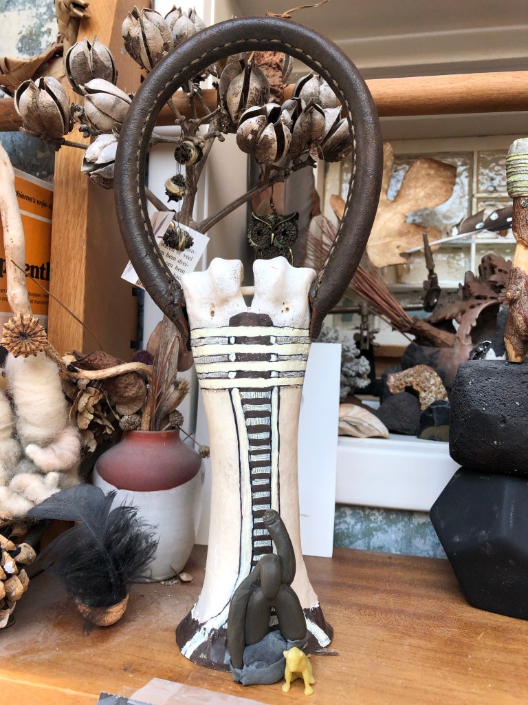 Nu is het schuuratelier eindelijk weer heerlijk, verleidelijk (om daar eindeloos te spelen met mijn verzameling ‘Leather and Bones, Feathers and Stones’ ) en mooi opgeruimd en ik heb de Djed van het (waterbuffel)Been, dat ik zelf in Thailand heb gevonden en dat een paar jaar als zwaar maar stevig en goed in de hand liggend handvat in mijn zelfgemaakte 13-manen drum hing, verder afgemaakt. Hij staat nu rechtop en heeft een nieuwe functie en betekenis gekregen en is nu ook heel mooi verbonden met een leren lus bij wijze van Ankh/vrouwelijk principe, aan het hoofd. Kijk maar..: