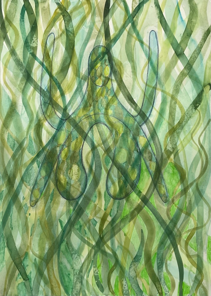 Voel of zie weer dat je lichaam groen is. Adem diep in; bij het uitademen ontdoet je hoofd zich van het groen. Haal nog eens diep adem; bij het uitademen verlaat het groen je schouders, borst en armen. Blijf in- en uitademen tot al het groen weg is en jij helemaal aanwezig en verkwikt, ontspannen en gesterkt ben. Welkom terug!