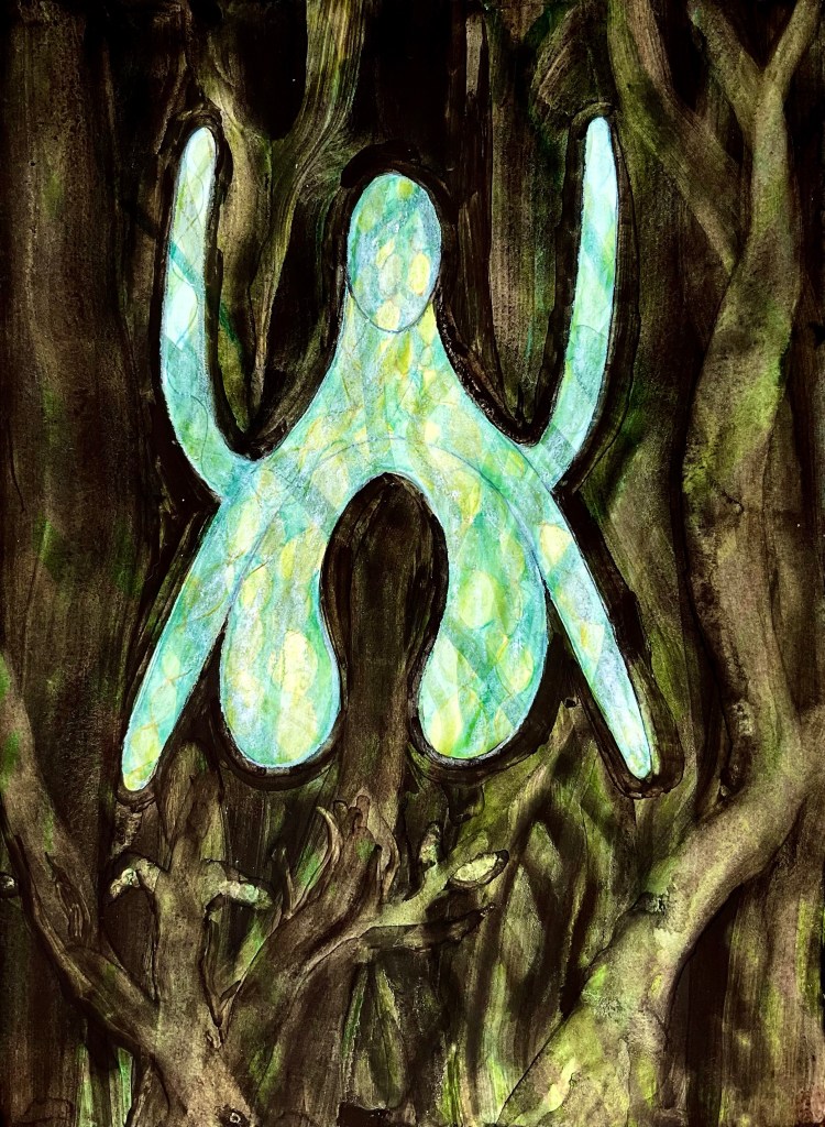 Daarna begon ik mijn ervaring te verwerken in een Clitootje tekening. De foto hierboven is genomen in een eerder stadium van de tekening. Hieronder zie je het eindresultaat. Ik heb uiteindelijk Clitootje, met haar transparante huid uit de bosmuur gelicht door haar omgeving donkerder te maken. Clitootje met haar etherisch dubbel lichaam (Ka). Ether, het vijfde element, het vijfde ritme, de levende Stilte.