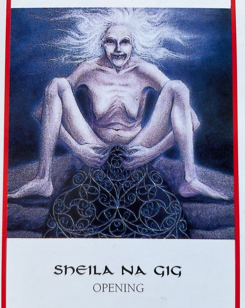 Ik zal hieronder eerst een stukje overtypen uit het Godinnen Orakel van Amy Sophia Marashinsky, ‘de grenzeloze wijsheid van de oervrouwen uit mythen, sagen en legenden.’ Het is een begeleidende tekst uit het boekje bij de kaart van Sheila Na Gig.