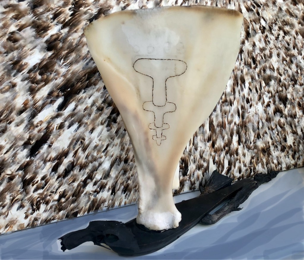 In het zeil (voorheen het schouderblad van Rund) heb ik het Maya-symbool T van ‘de Geest die vanuit het hart spreekt’ , ook wel IK (spreek uit IEK) of de Witte Wind genaamd, 4 maal boven en in elkaar gebrand (en reken maar dat dat stonk als een kleine crematie ;).