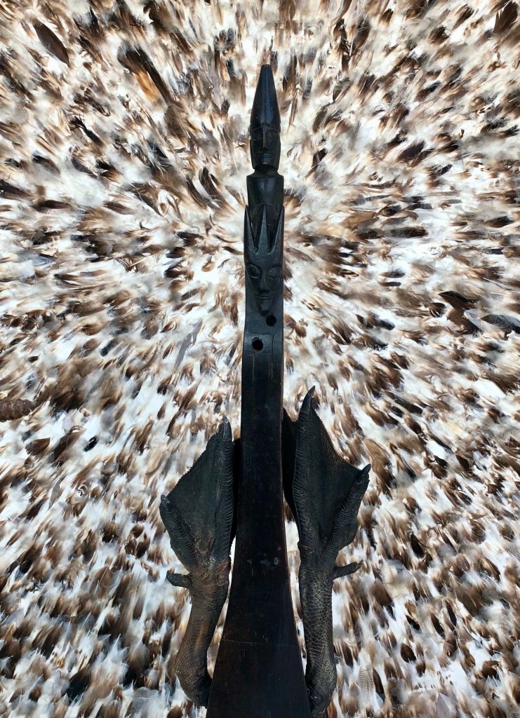 De romp van het schip bestaat uit een houten, voormalig snaarinstrument (snaar-loos gescoord in een kringloopwinkel), waaraan ik bij wijze van zij-zwaarden 2 gedroogde poten van Meerkoet heb bevestigd.