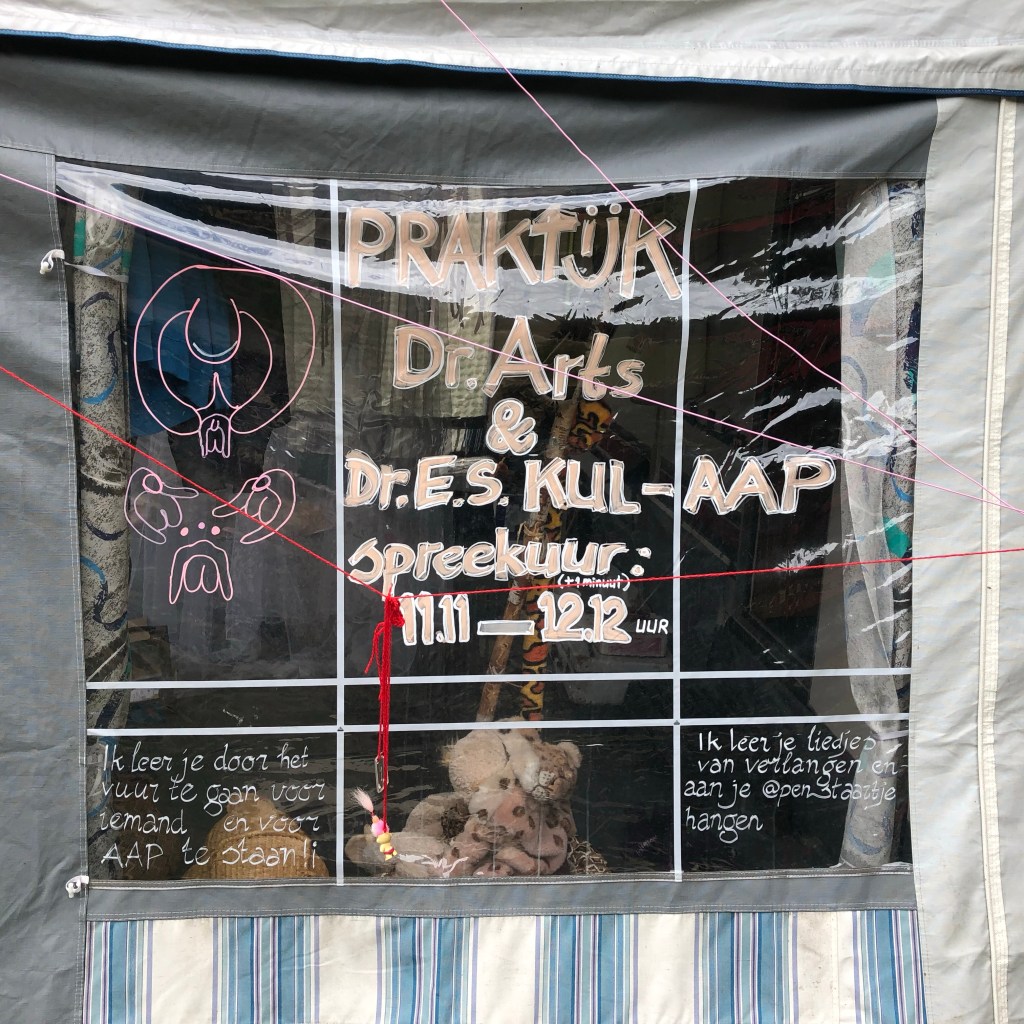 Het komt eigenlijk zo: ik vond de bovenste 2 afbeeldingen (exitádo=opgewonden, flácido=slap) ooit op het internet en printte ze uit voor educatieve doeleinden op het Lorelei vrouwenfestival in 2023. Daar hield ik toen als Dr. Arts tijdelijk praktijk samen met Dr. E.S. Kul-Aap. Dat educatieve is er niet zo van gekomen toen, maar ik en mijn collega (me and my monkey) hebben toen wel heel leuk doktertje gespeeld op het festival. […] Meestal liep ik in mijn doktersjas rond over het festivalterrein en maakte her en der praatjes, pardon, gaf consulten met consensus, aan wie dat maar wilde en dokter Aap hield spreekuur bij de tent (en Beer, die ook mee was, was de patiënt).