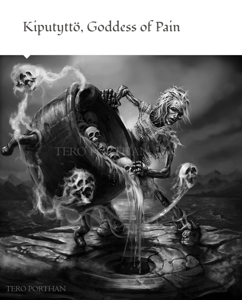 ( … ) “In de Kalevala wordt Kiputyttö gevraagd om pijn naar een plek te brengen waar het niet kan worden gevoeld, zoals de bodem van een oceaan. (…)
