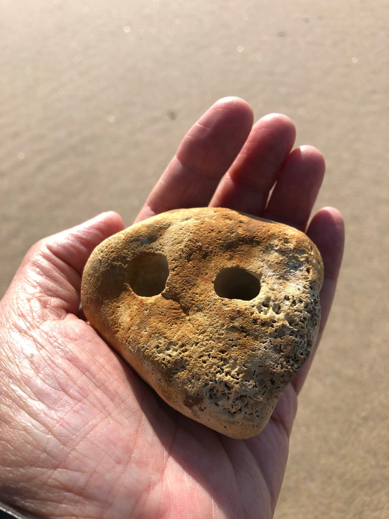 Nou wilde het toeval dat de oma van Tova (van vaders’ kant) een hele koektrommel vol stenen en steentjes met gaten had nagelaten. Niemand van de familie hoefde ze. Ik bracht de volle trommel als een grote schat mee naar huis. Hier op het strand van Walcheren heb ik trouwens ook al verschillende ‘heksenstenen’ opgeraapt en aan de verzameling toegevoegd.
